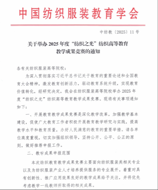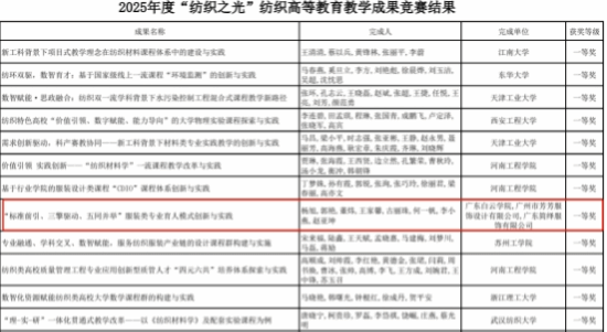 2025年8月29日,中国纺织服装教育学会正式公示"纺织之光"年度高等教育教学成果奖拟获奖名单。由广东白云学院国际时尚设计学院杨旭老师领衔申报的《"标准前引、三擎驱动、五同并举"服装类专业育人模式创新与实践》项目,在东华大学、北京服装学院、武汉纺织大学、西安工程大学、苏州大学、江南大学、浙江理工大学、天津工业大学等众多名校参与的594个申报项目中脱颖而出,荣获一等奖。