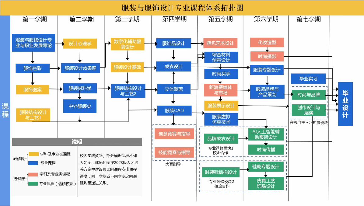 校内集中实践教学环节:服装款式图设计训练、服饰图案设计训练、创意时装画设计训练、成衣设计与制作(立裁)、服饰数字化设计训练、手工皮具设计与制作、创意设计强化训练、服装展示设计强化训练、服装创新项目实践、品牌企划综合创作、服饰品综合创作。
